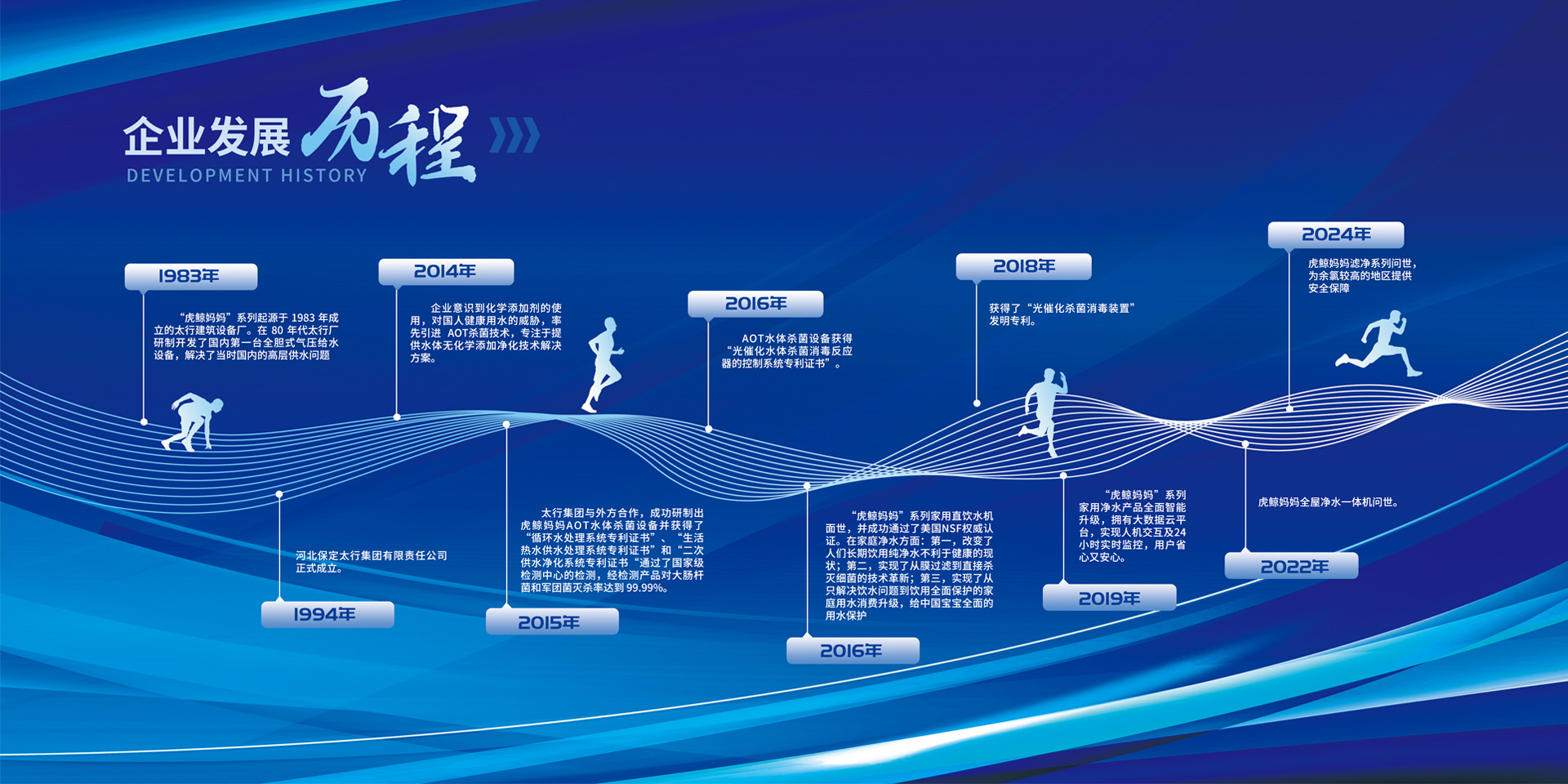 2014年,太行集团从瑞典引进水体净化AOT(ADVANCED0XIDATION TECHNOLOGY)杀菌技术,开发出无化学添加剂,又能有效控制水体微生物和其他有害物质的设备和系统。设备现如今在清华大学、北京交通大学、天津大学等生活热水系统中已经使用。
